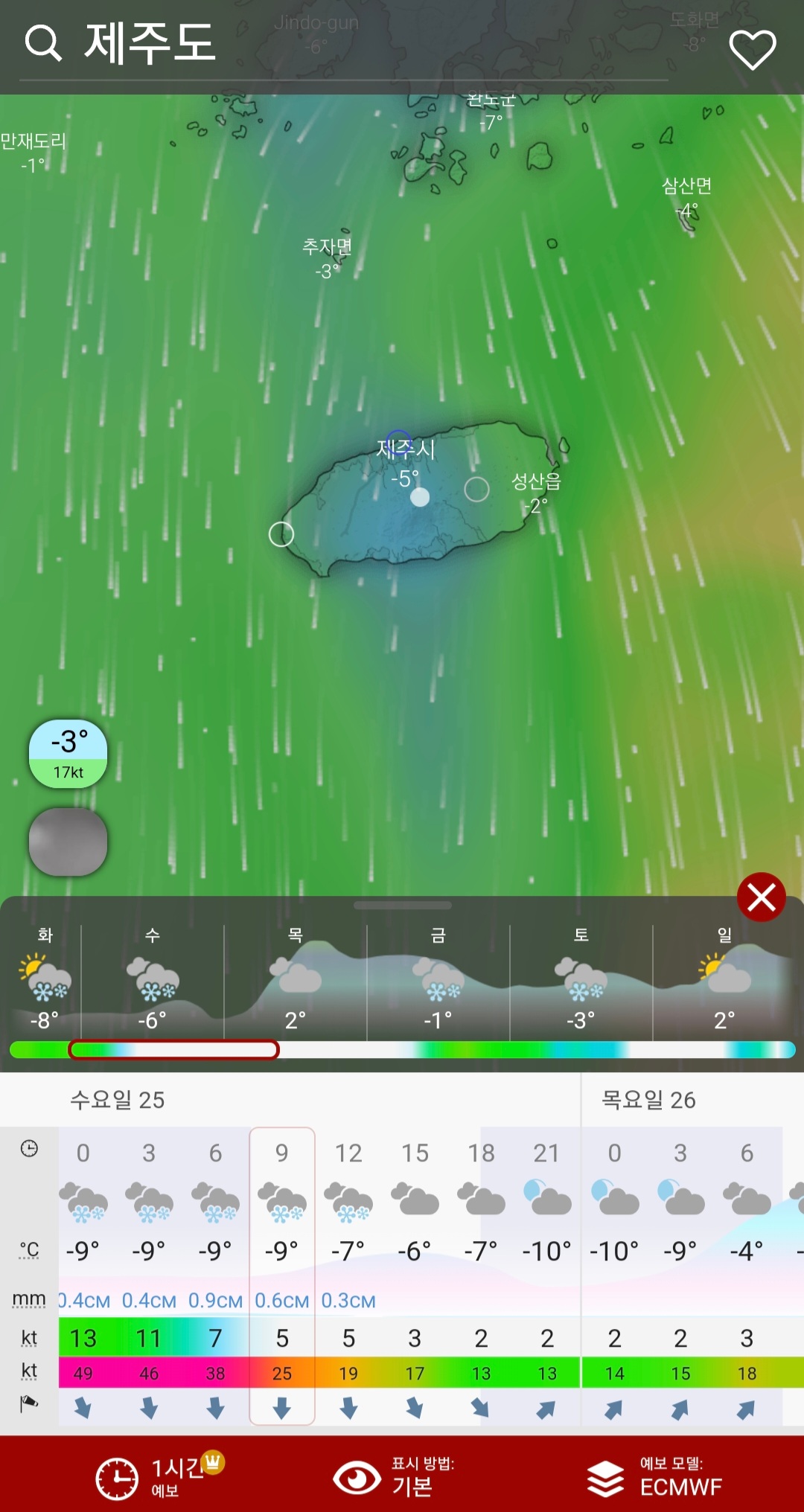 Windy 어플 수요일 25일 09:00을 클릭하여 보면