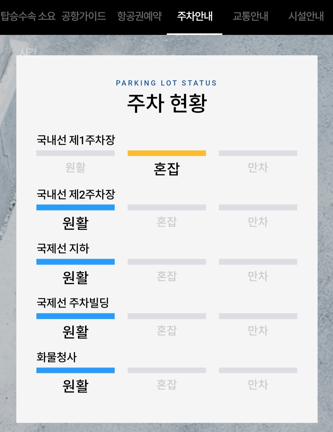 김포국제공항 홈페이지 메인 화면에서 스크롤을 밑으로 내리면 주차장 포화분포도를 확인할 수 있으며, 네이버 검색창 공항 검색으로도 주차장 포화분포도를 확인이 가능합니다.