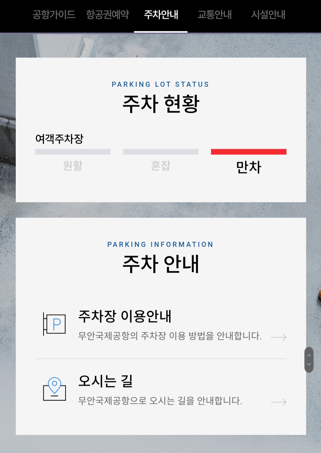무안국제공항 주차장 현황은 홈페이지에서 주차안내 란에 주차장 현황이 나오며, 원활, 혼잡, 만차로 표시되어 있어 주차 상황을 미리 확인할 수 있습니다.