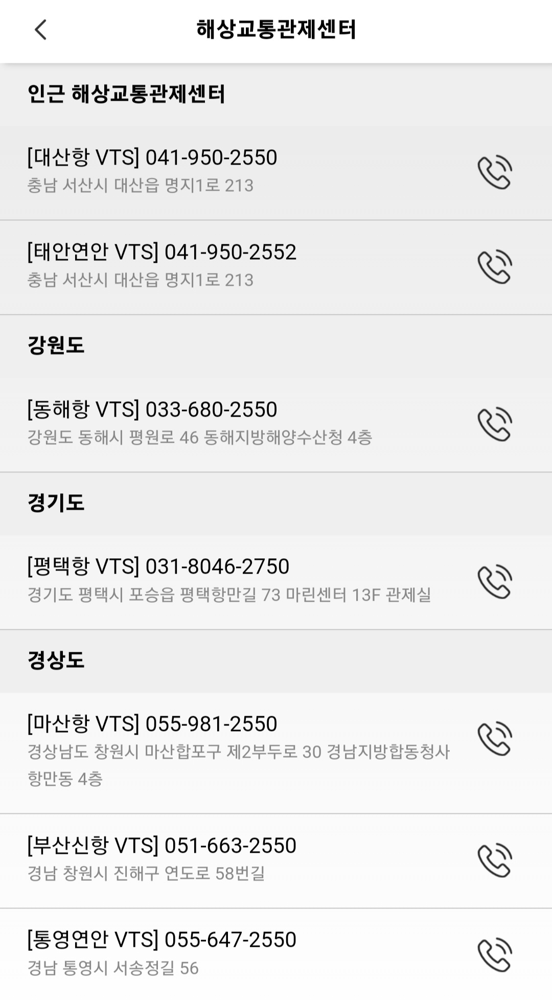 - 인근 관제센터의 연락처 주소 및 바로 통화하기 기능을 제공합니다.