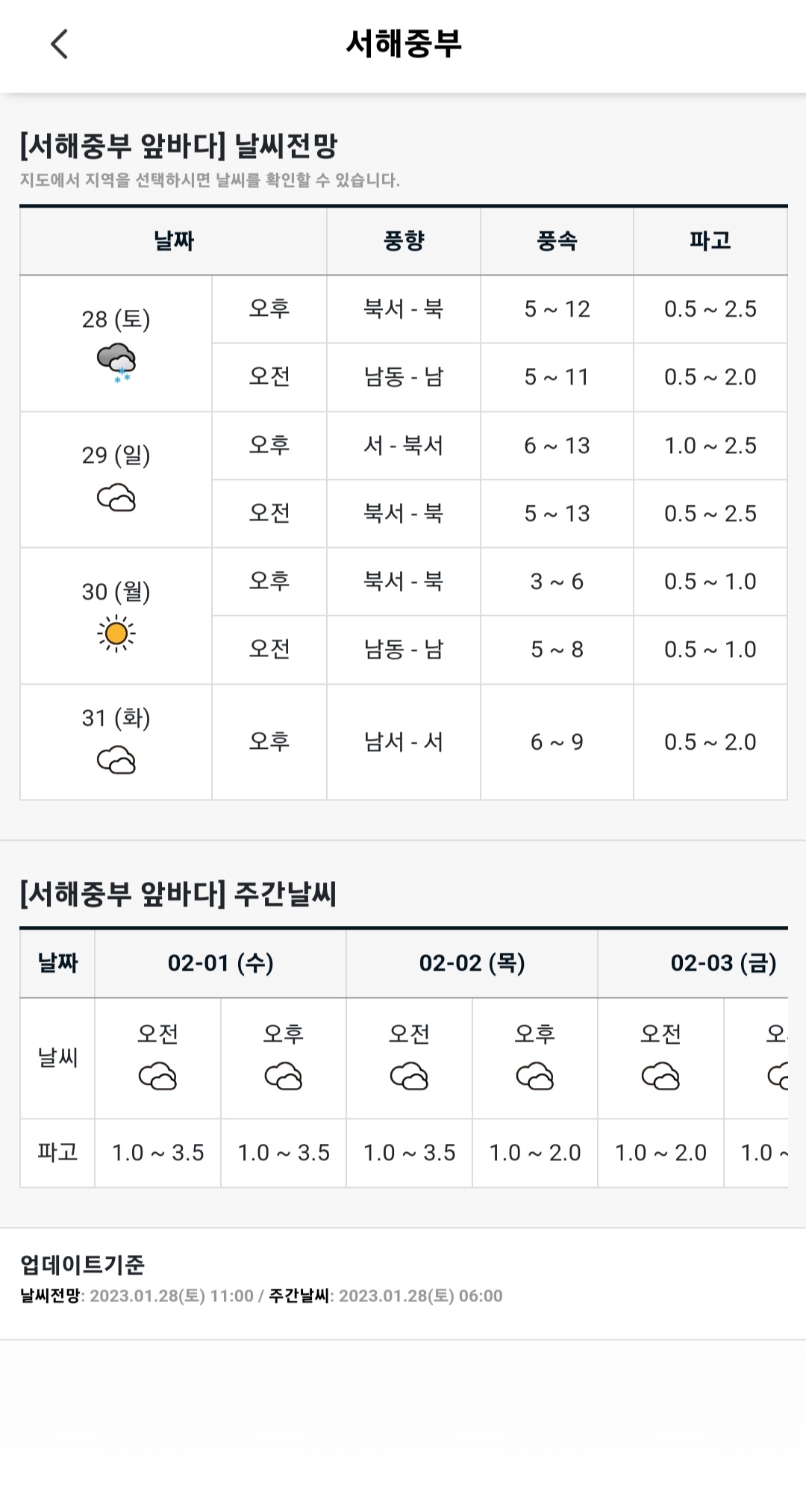 서해 중부 앞바다 날짜, 풍향, 풍속, 파고, 주간 날씨 등 상세한 날씨가 나옵니다.