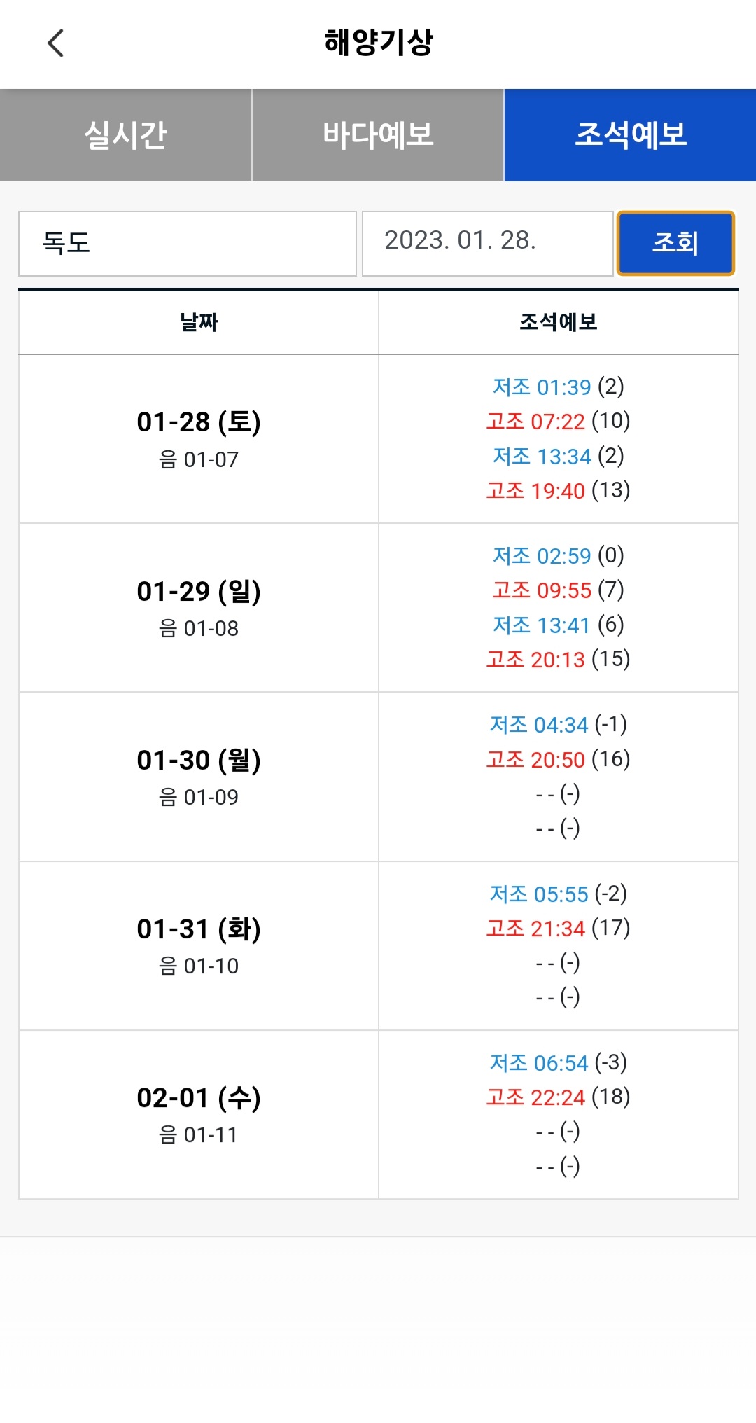 조석예보에서 원하는 위치의 날짜를 검색하면 그날의 조석예보인 고조시간저조시간을 표시해 줍니다.