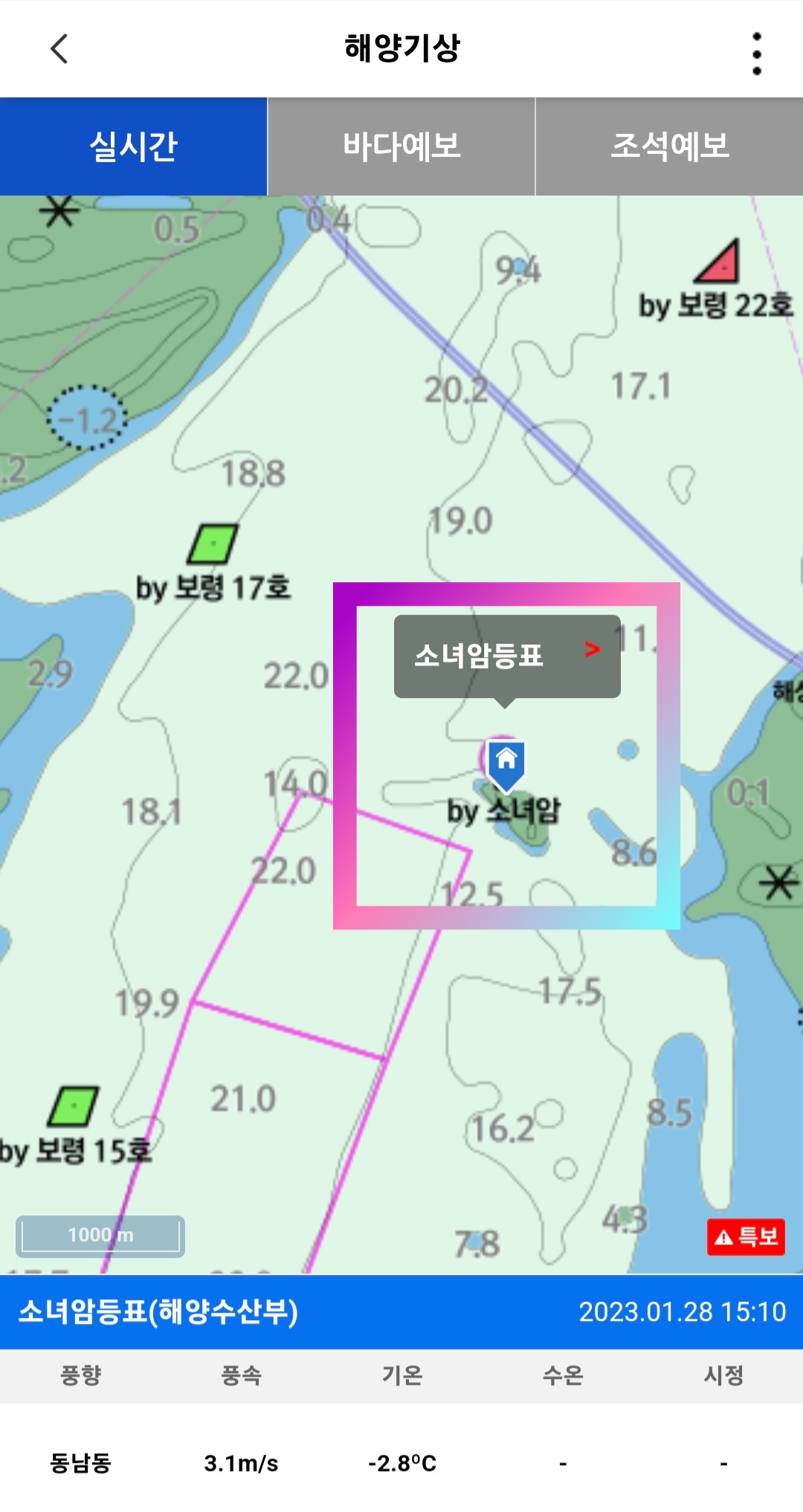 실시간 해양기상으로 집 모양 아이콘을 클릭하면 풍향, 풍속, 기온, 수온, 시정 등 표시됩니다.