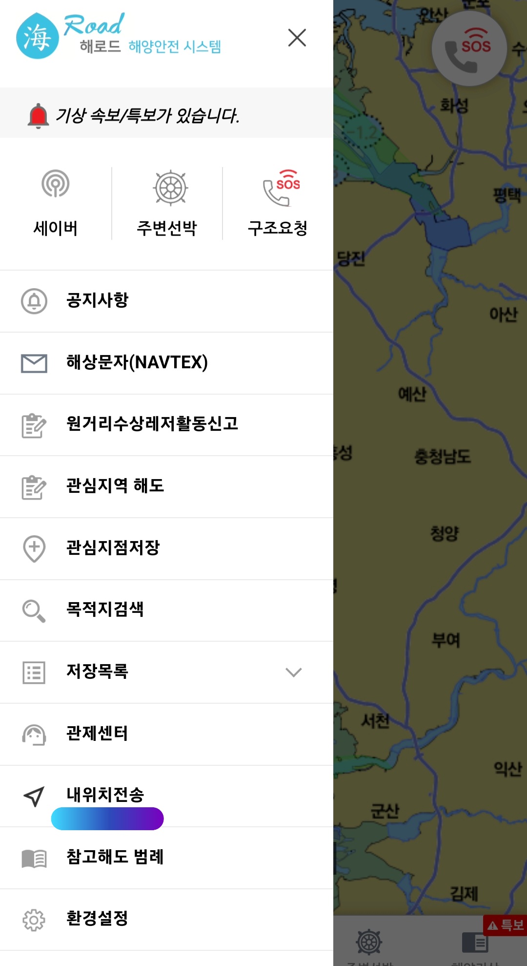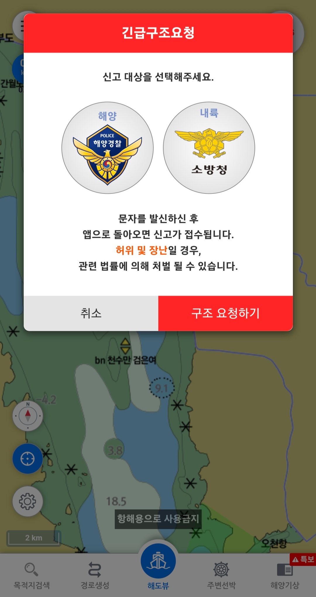 - 가장 중요한 기능으로 바다에서 위험한 상황이 발생할 때에 SOS 버튼을 누르면 해양경찰청(122)과 소방청(119)을 선택하여 위치 정보 전송가능하여 자신의 바다의 위치를 정확하게 알려주고 위험 신고가 됩니다.