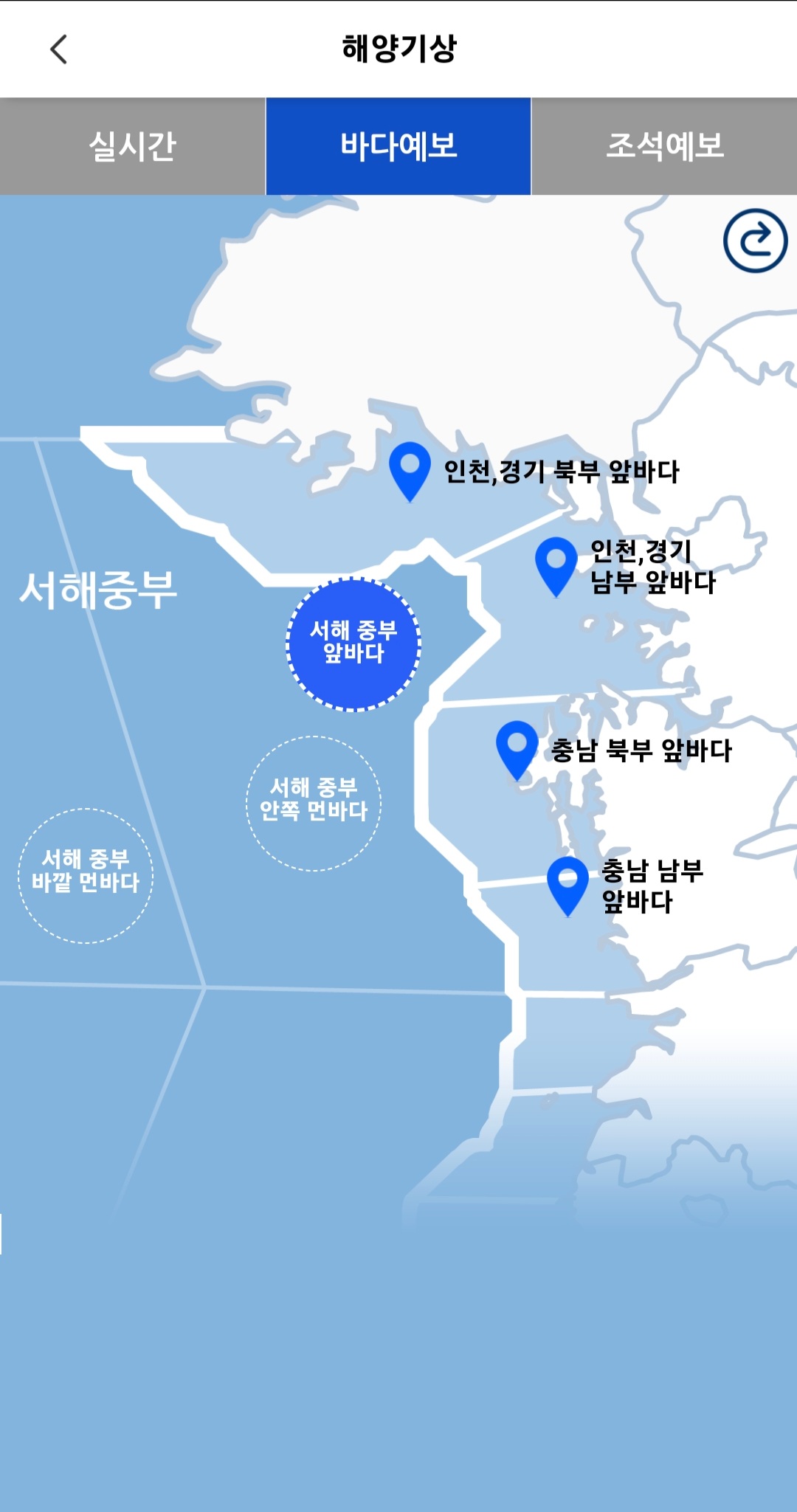 바다예보에서 필요한 위치의 날씨를 클릭(서해 중부 앞바다)하게 되면 바다예보의 상세 날씨가 표시됩니다.