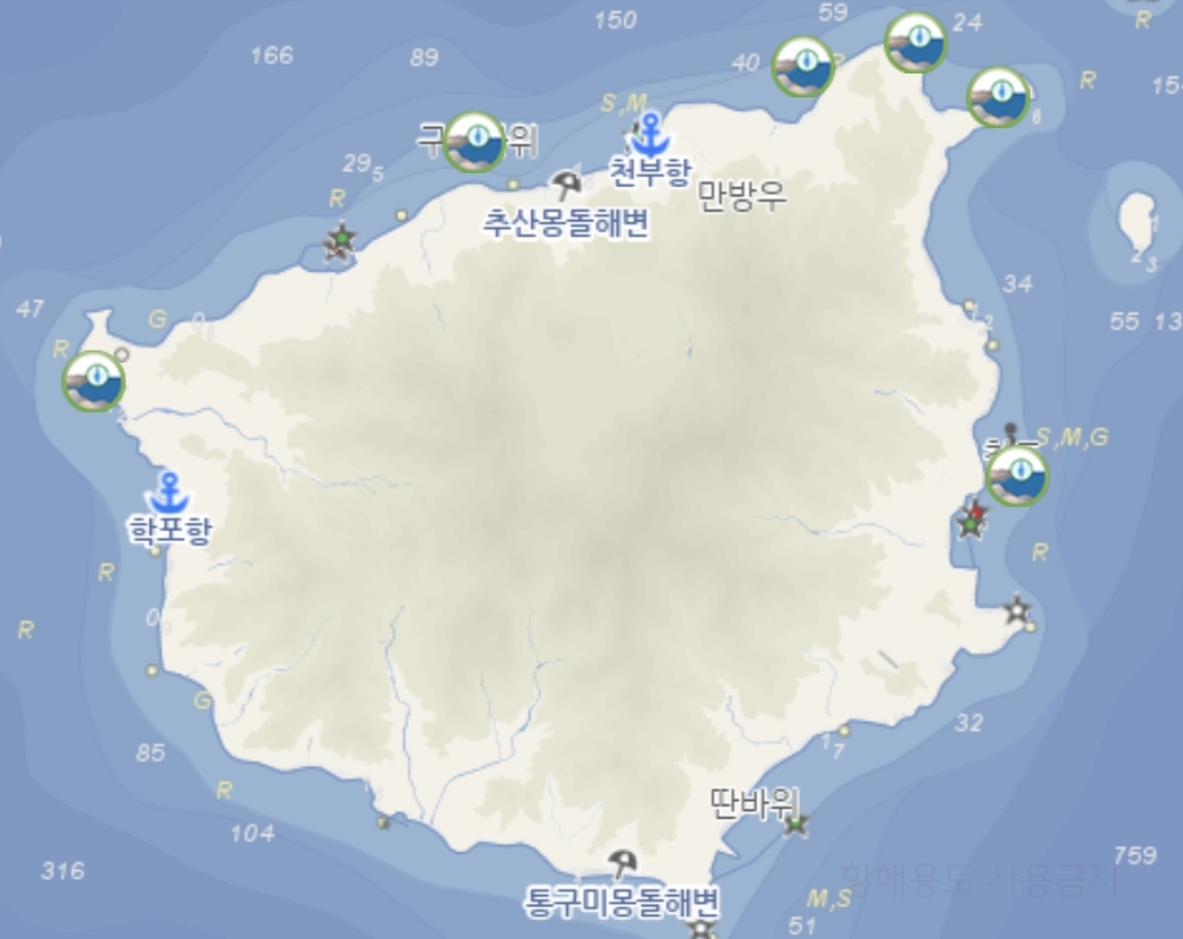 다른 섬에 비해 수심이 깊으므로 갯바위 낚시를 할 경우, 주의해야 합니다.