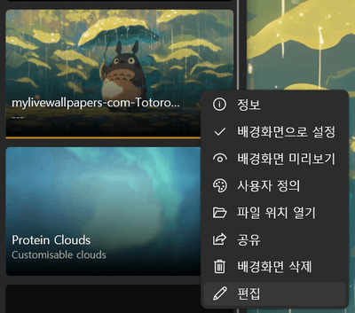 7. 움직이는 배경화면 설정을 취소하고 싶다면 설정한 그림의 우측에 위치한 설정에 들어갑니다. 가장 아래에 위치한 편집을 선택 후 취소를 하면 설정된 움직이는 배경화면이 기존에 설정한 멈춰있는 배경으로 변경됩니다. 그 외에도 화면보호기 또는 듀얼화면 등 윈도우 화면을 다양하게 설정 가능합니다.