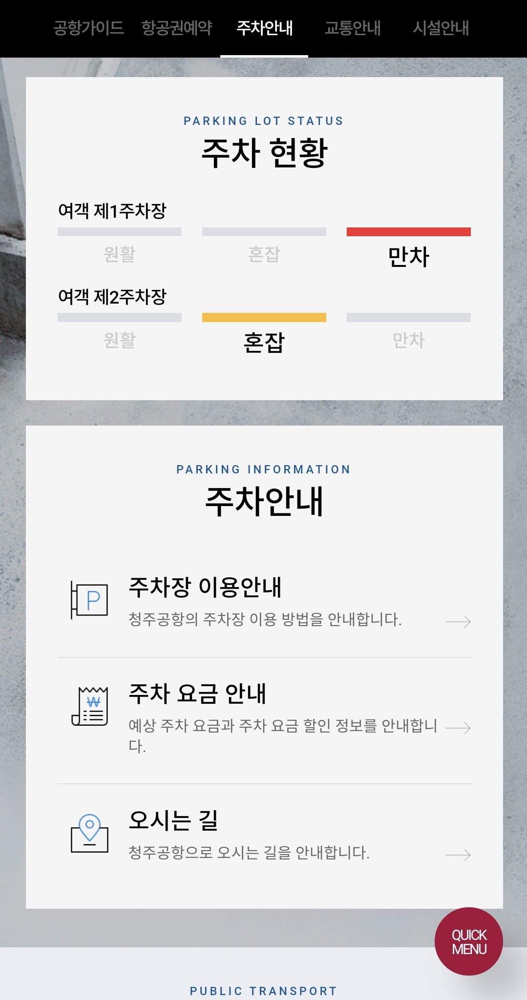 청주공항 홈페이지 메인 화면에서 스크롤을 밑으로 내리면 주차장 포화도 현황을 확인할 수 있습니다.