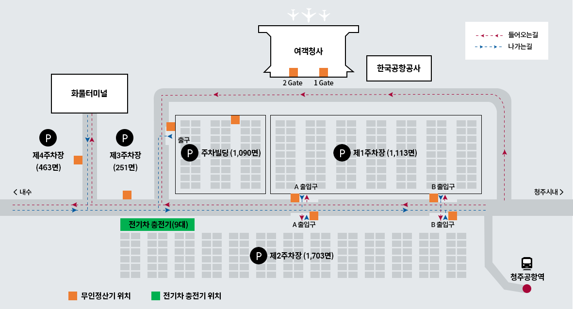 청주공항 주차장은 제1, 제2, 제3, 제4 주차장으로 구성되어 있습니다.