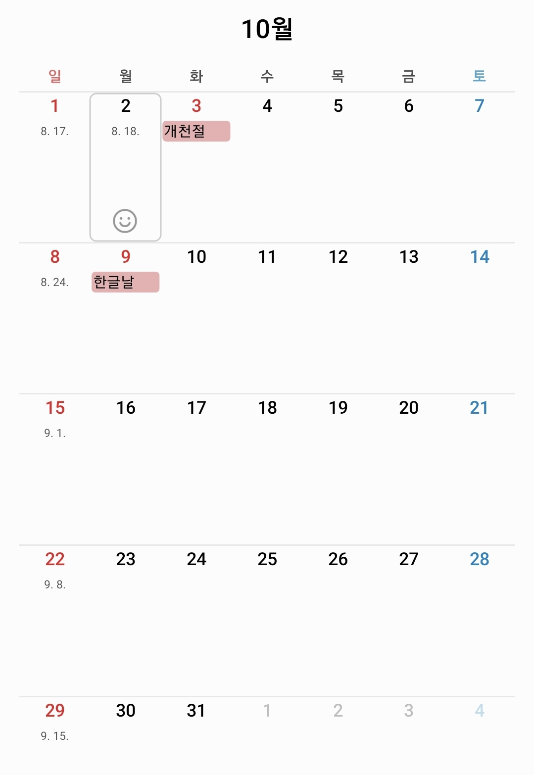 - 10월 7일 ~ 10월 9일(한글날)