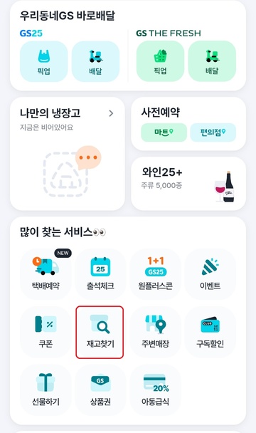 우리동네GS 어플 앱 메인화면상에서 재고찾기를 클릭합니다.